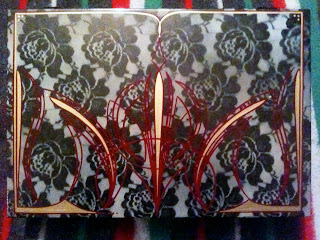 The box was a shit fire engine red, so the first thing to go was the outer paint scheme. I did a black undercoat, nothing too flash, with an ivory and gold rose lace overlay on the back, and a black and ivory rose lace on the top. Anyone who knows me knows I love doing a bit of lace paneling paint jobs, but this time it worked out exceptionally well as the case was for someone who has a bit of a weakness for roses. After laying some playing cards on the back and lacquering over the whole thing I moved onto the interior of the case.